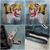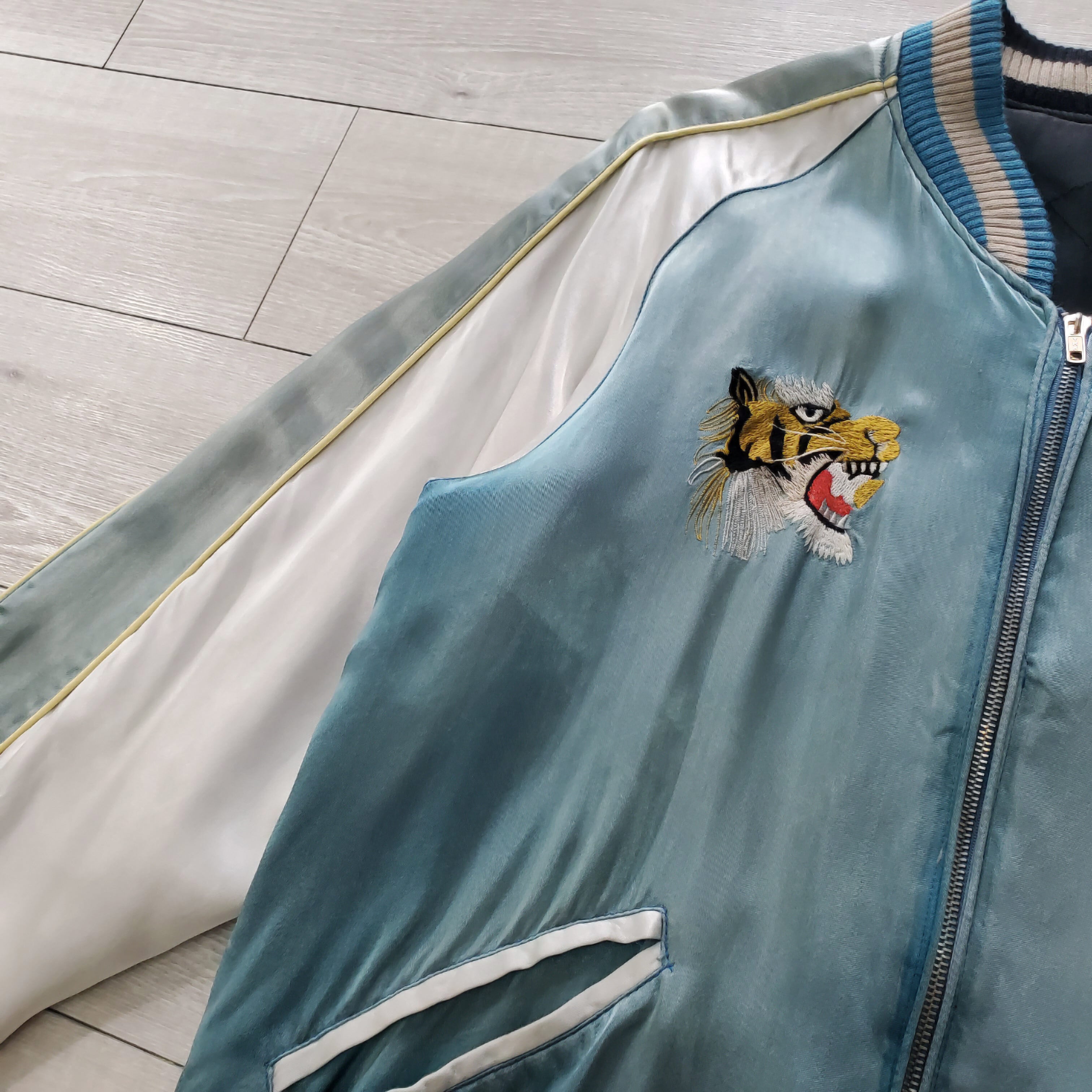 レーヨン特有のもったりとした落ち感と光沢感、YKK製の両開きジッパー、厚みある刺繍糸、鋭い眼差しの虎といった、90年代復刻品によく見られるディテールを備えています。