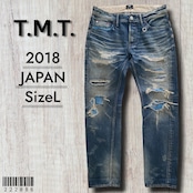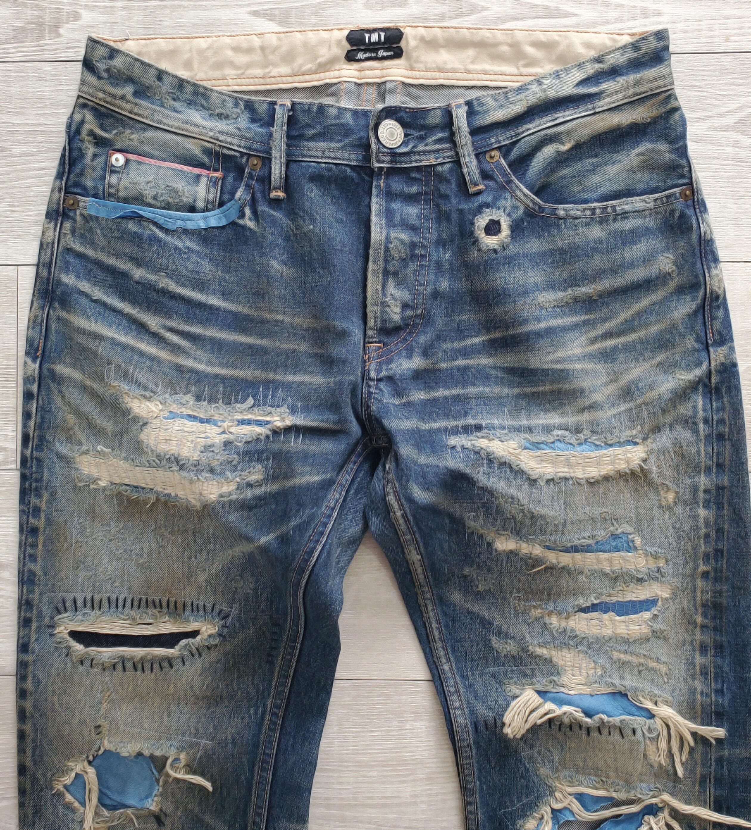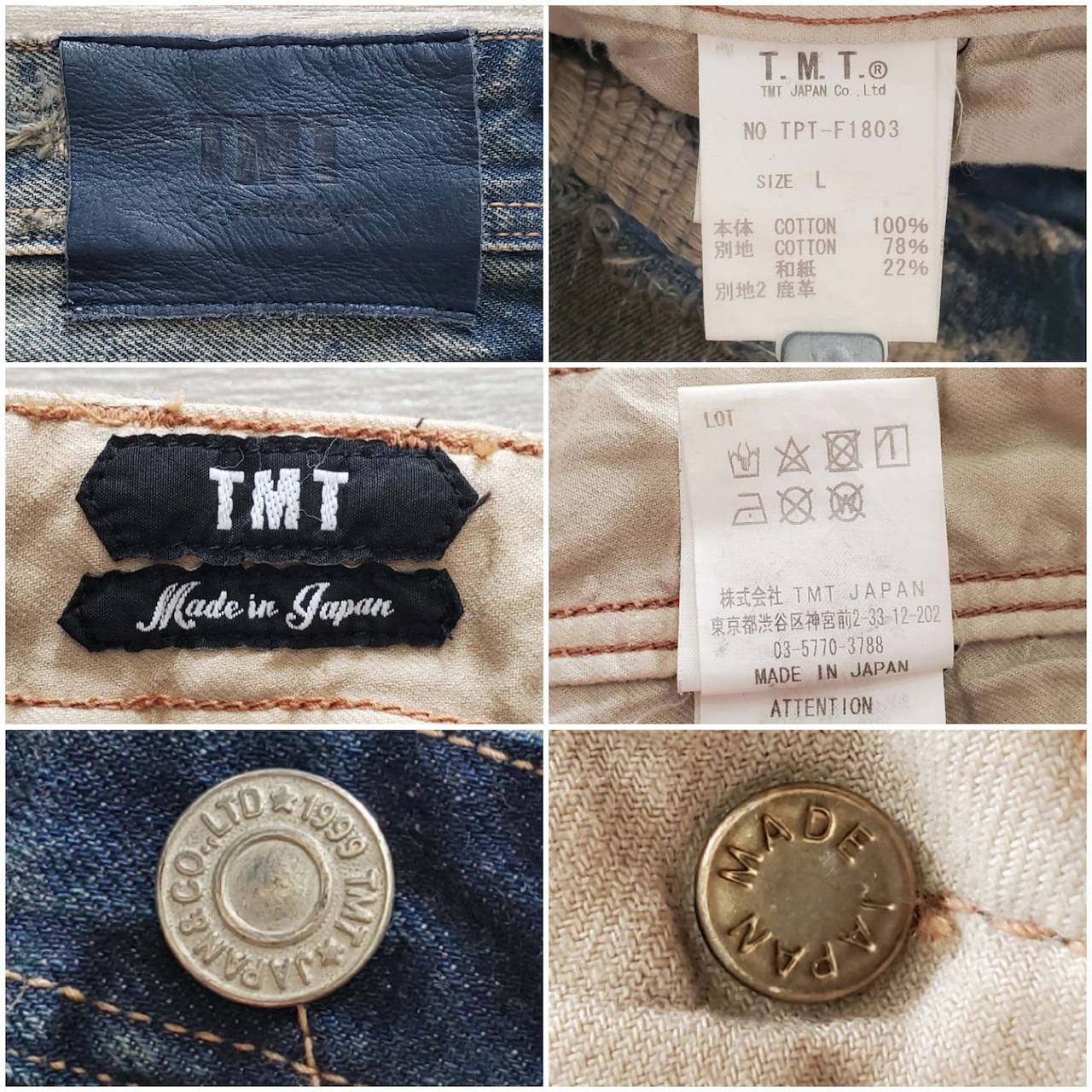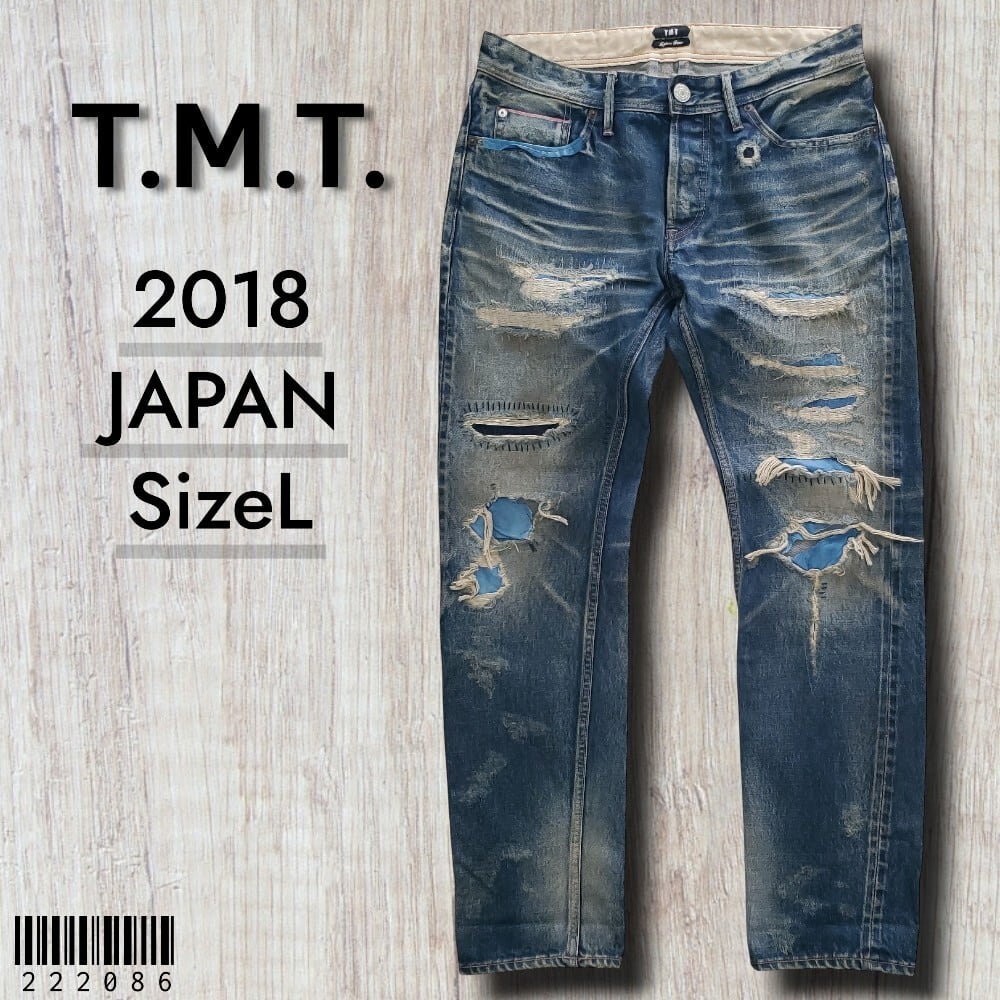 TMTティーエムティー■美品 2018年 日本製 限定生産 HQ DEERSKIN REPAIR DENIM 5P TAPERED 14oz L 備後 リアルヴィンテージ加工 ダメージ クラッシュ リペア セルヴィッチ 赤耳 テーパード デニム 鹿革 定価50600 No222086