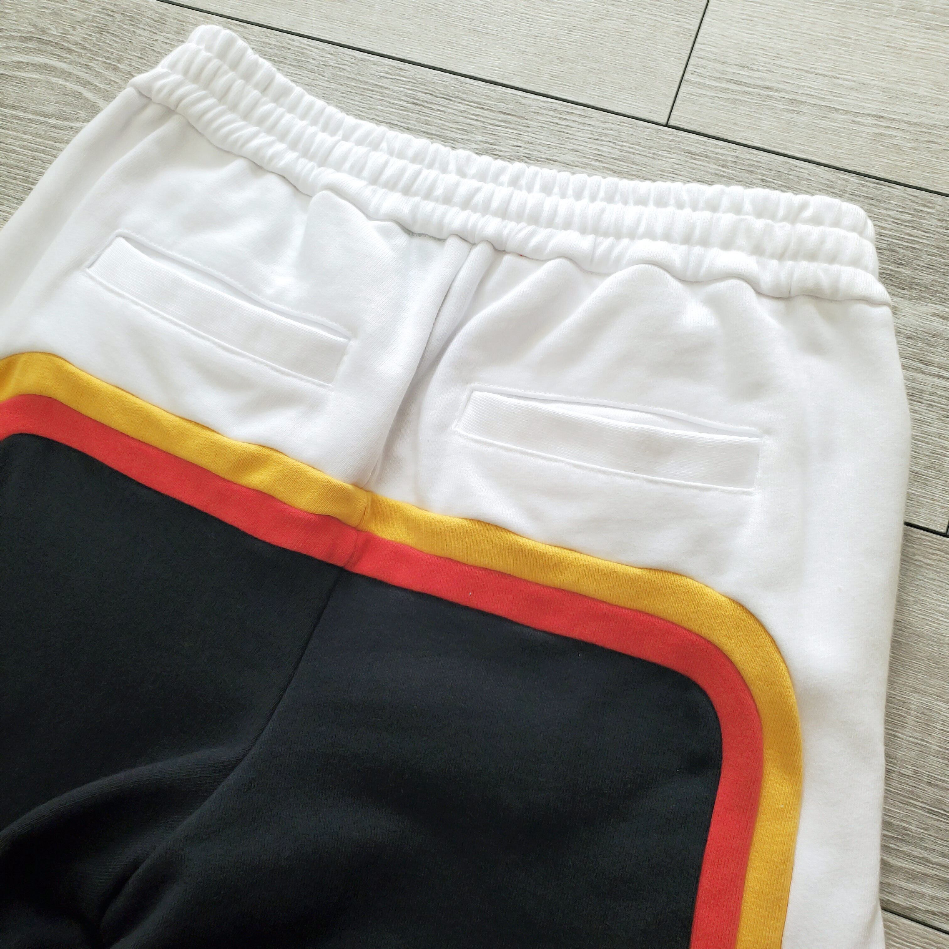レーシングパンツを彷彿とさせるサイドラインは、異なる配色の生地を重ねることで立体感と高級感を演出しています。