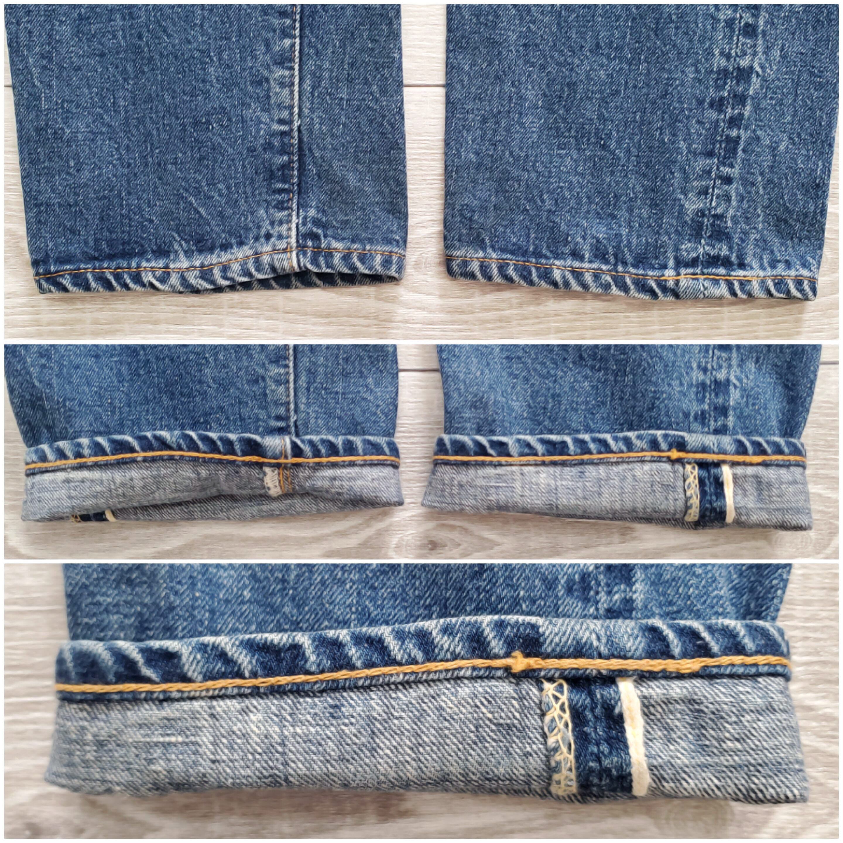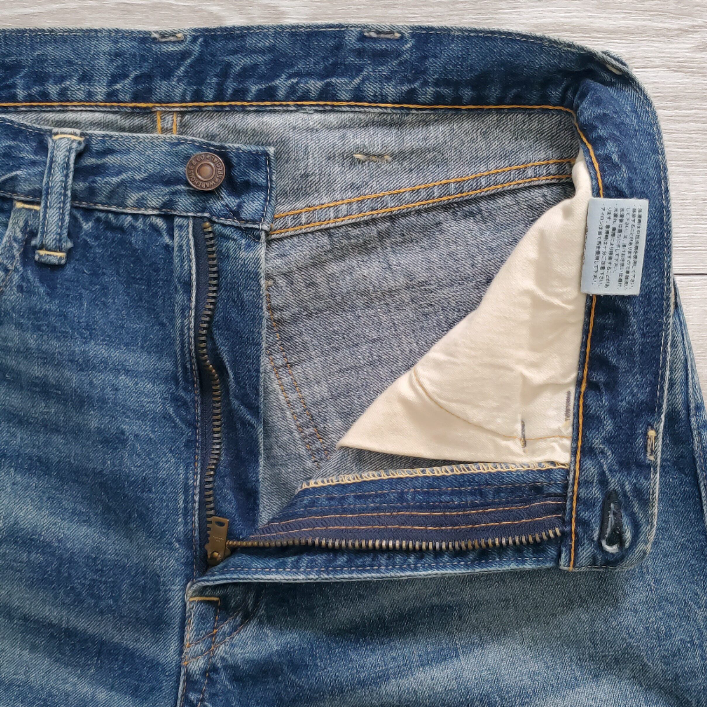 ヒゲや自然な縦落ち、綿糸(イエロー×オレンジ)の色抜け、裾のパッカリング、膝裏のハチノスなど、細部までリアルな経年変化を再現。