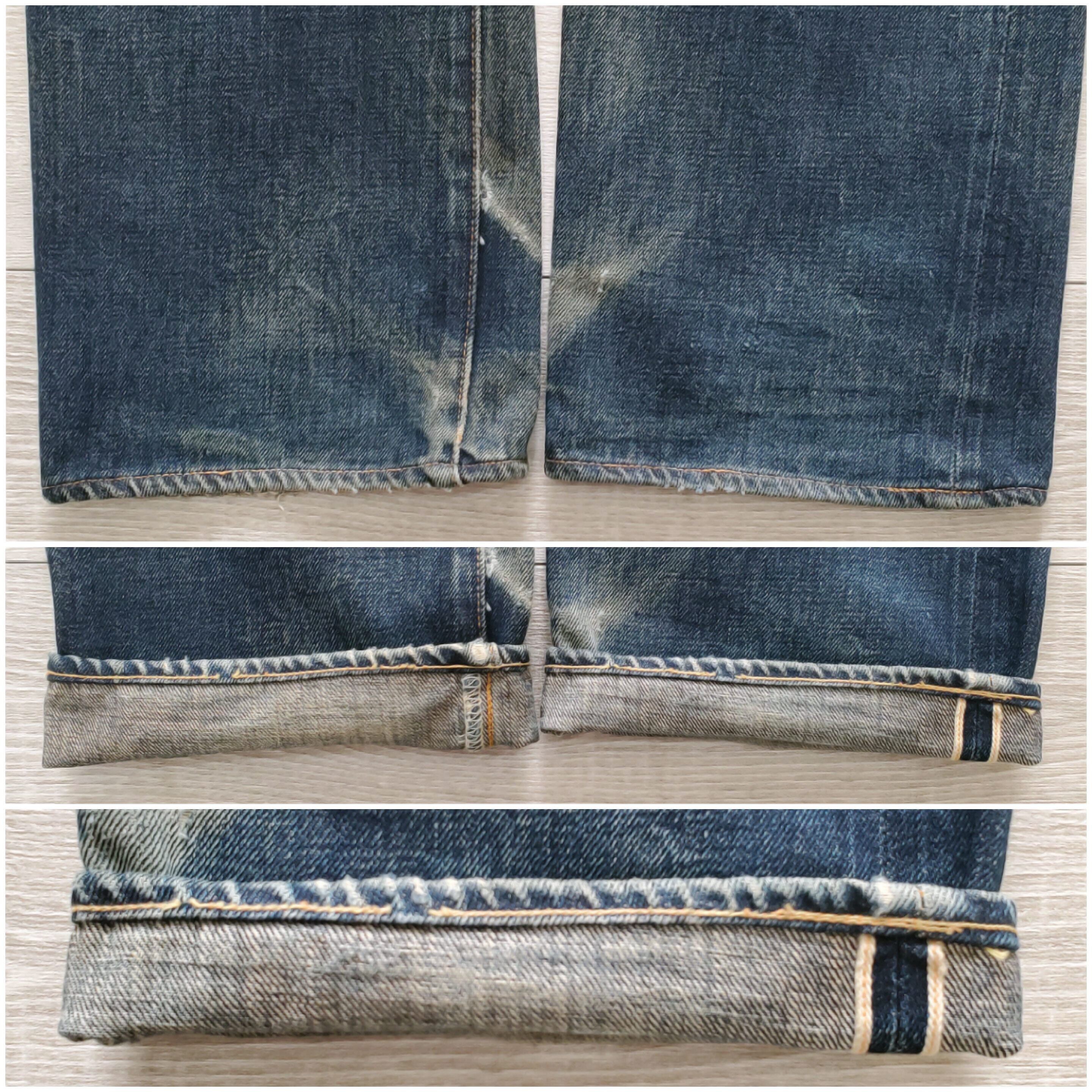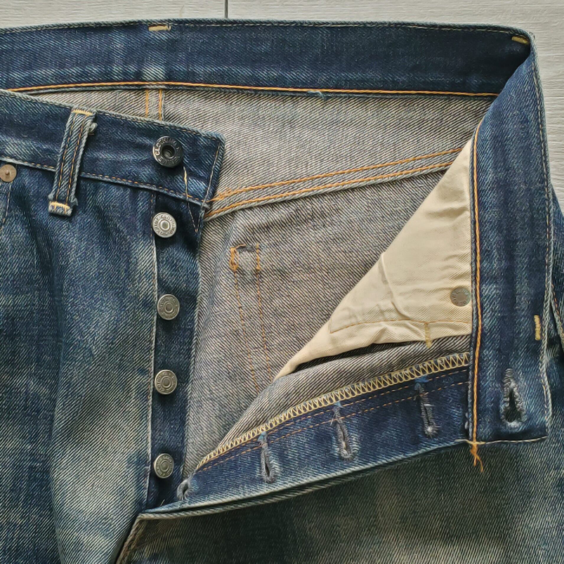 生地には旧式力織機で織り上げたセルビッチデニムを使用し、黒カン、コインポケット耳付き、裾黄耳、両面赤タブ、紙パッチ、フロントVステッチ、ウエストバンド上シングル下ダブル、内股シングル、バックポケットシングルステッチなど、ヴィンテージディテールを網羅しています。